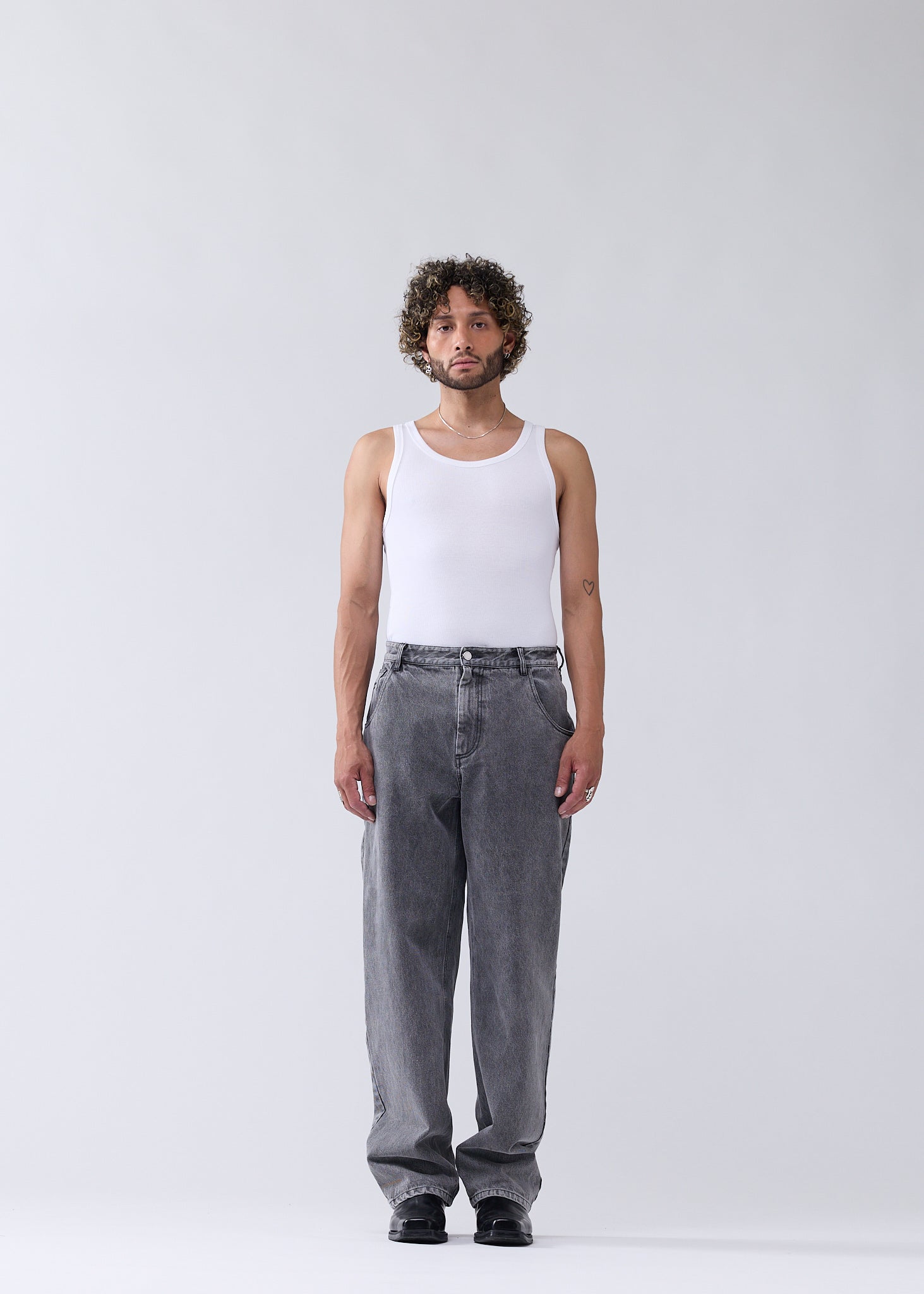 Denim trouser cut to a relaxed fit with a mid waist and a straight leg. The garment has a fixed waistband and is available in two lenghts. Detailed with a metal branded button, and New Amsterdam name embroidery above the left pocket. These pants are made out of a cotton denim.