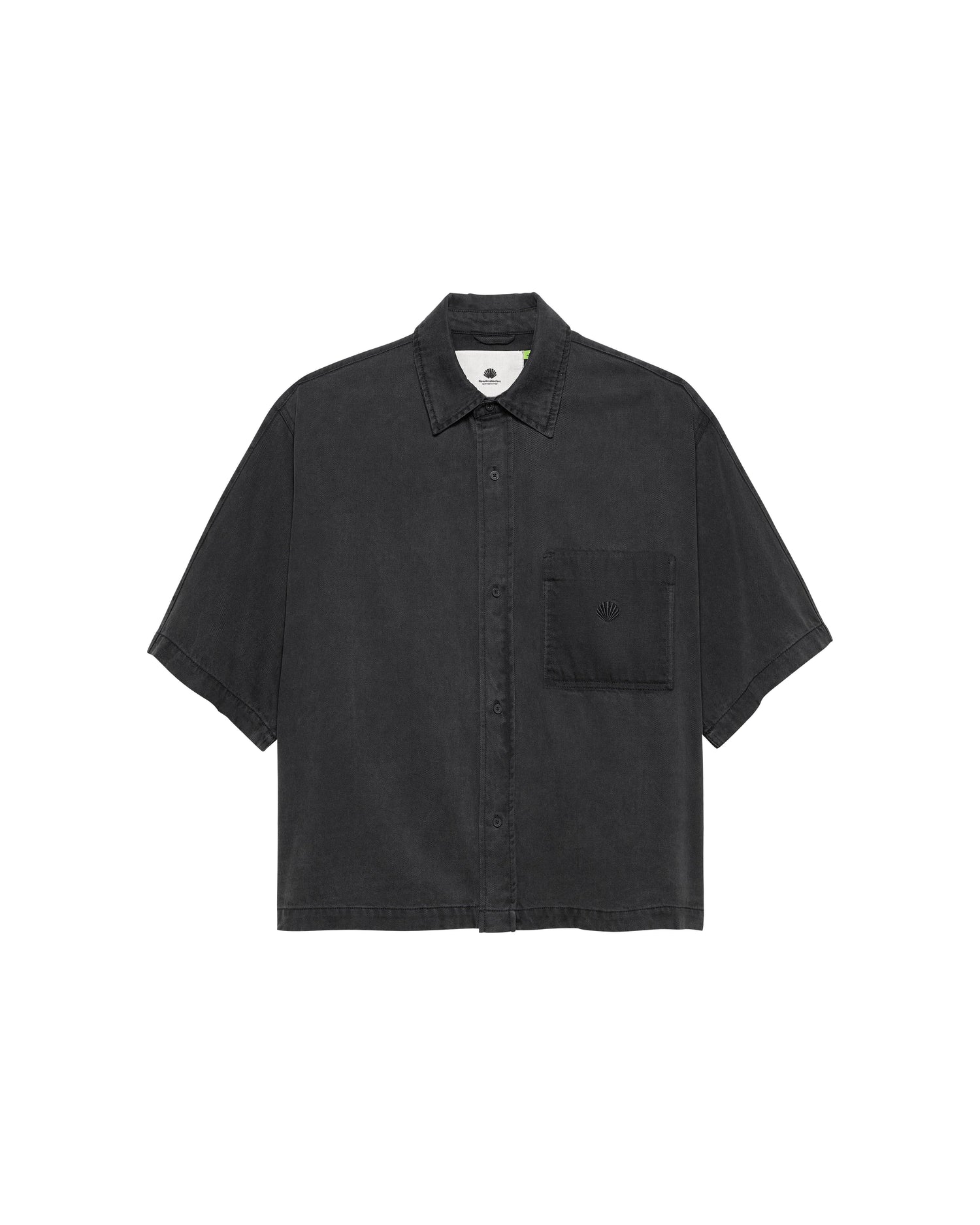 Button-up shirt is cut to a relaxed unisex fit with dropped shoulders and hip length. Complete with chest embroidery, chest pocket on the inside and centre front button-up closure. Made from cotton and lyocell fabric with washing.