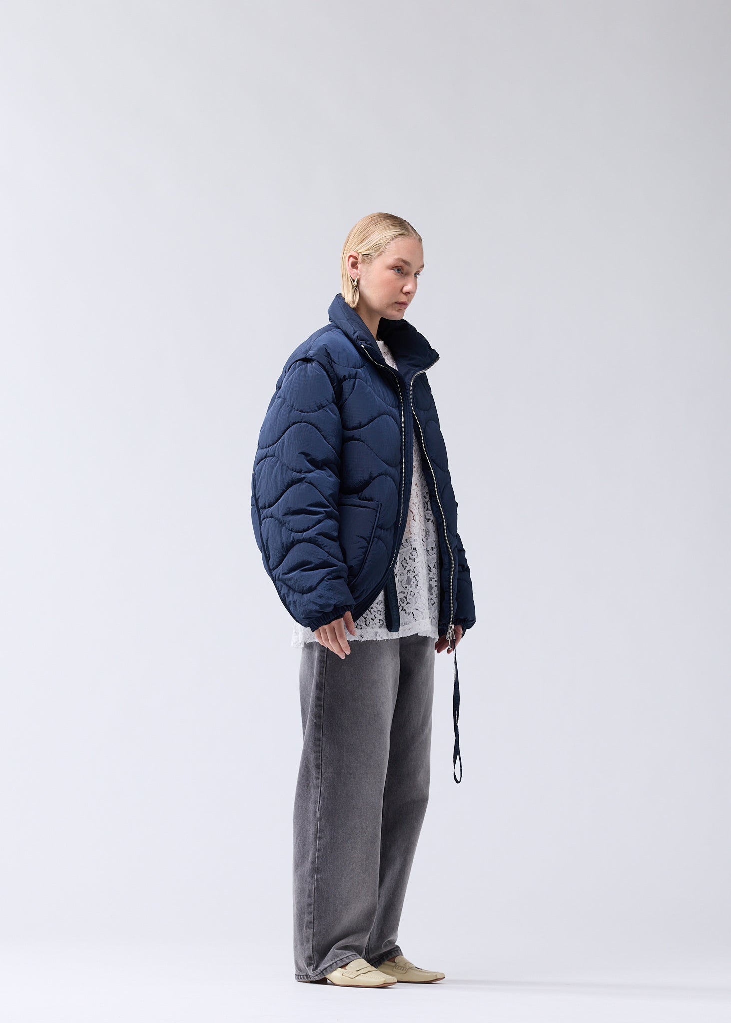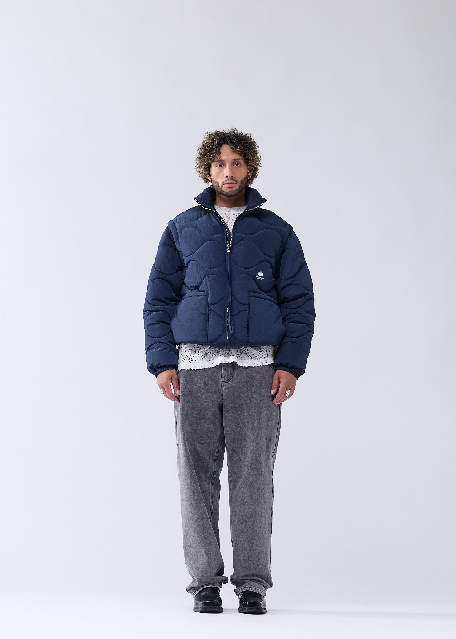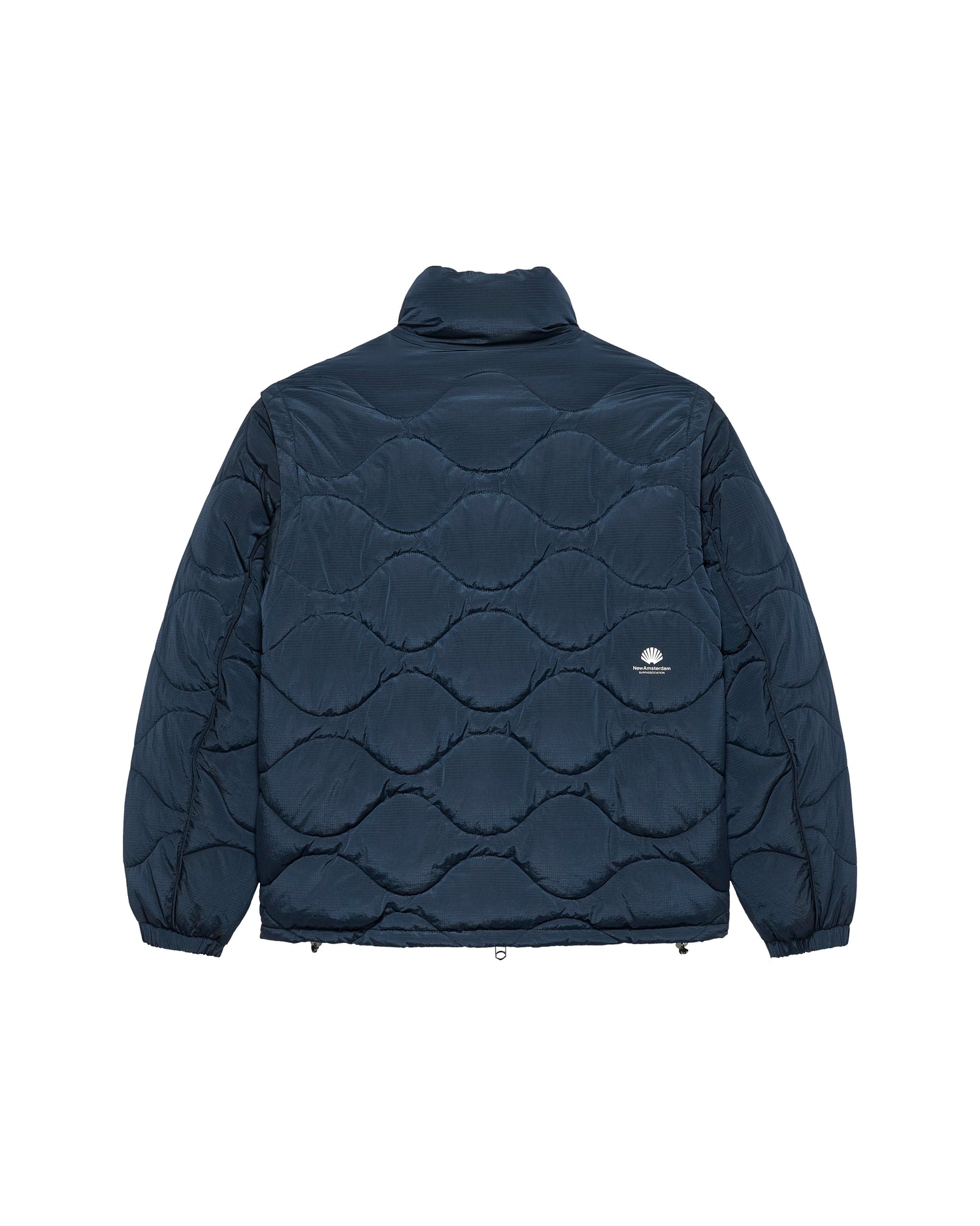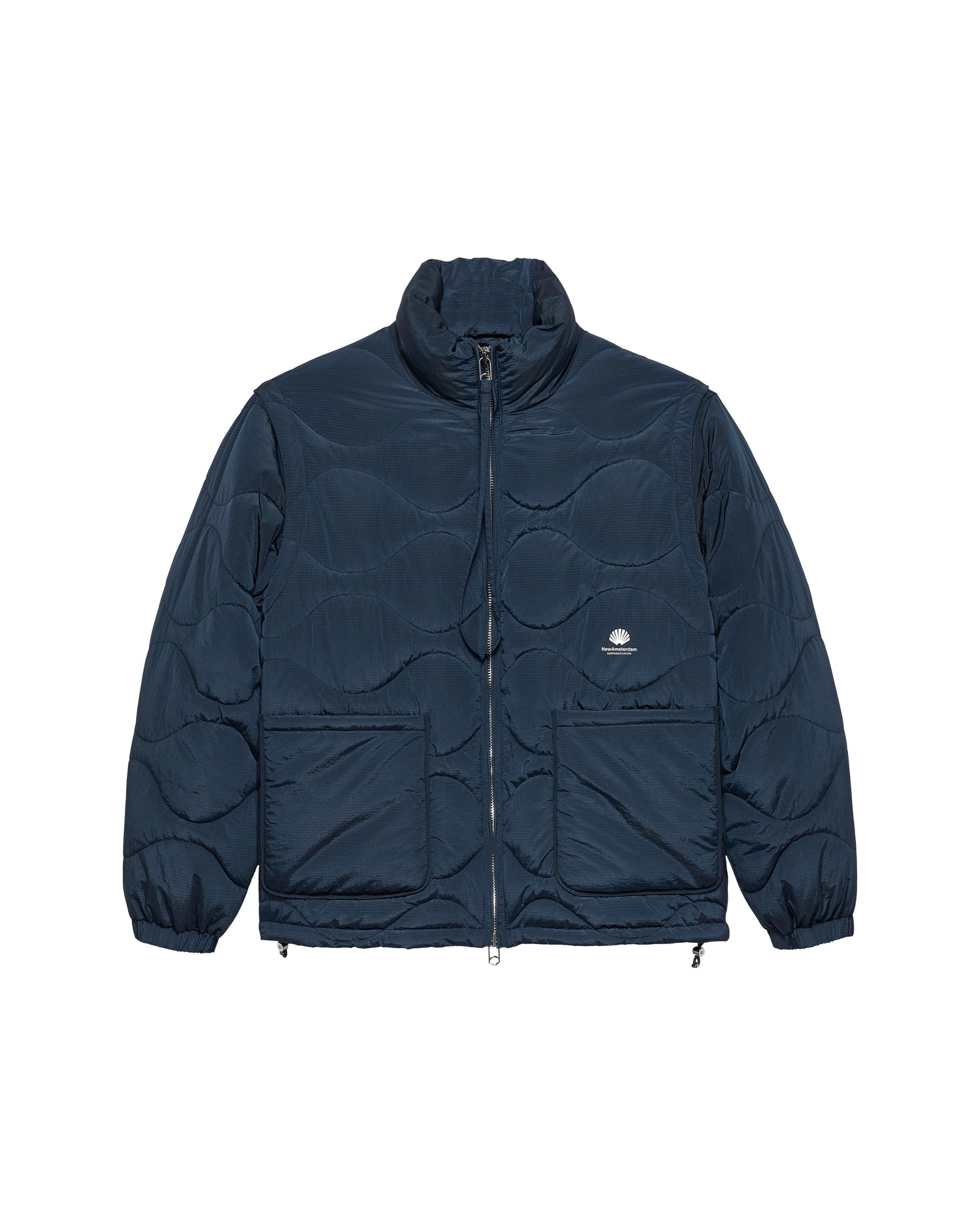 The Quilted Ripstop Jacket by New Amsterdam Surf Association is a versatile unisex outerwear piece with a regular fit and hip length cut. Made from shiny nylon ripstop with classic onion quilting, it’s padded with Repreve® recycled down for warmth and sustainability.