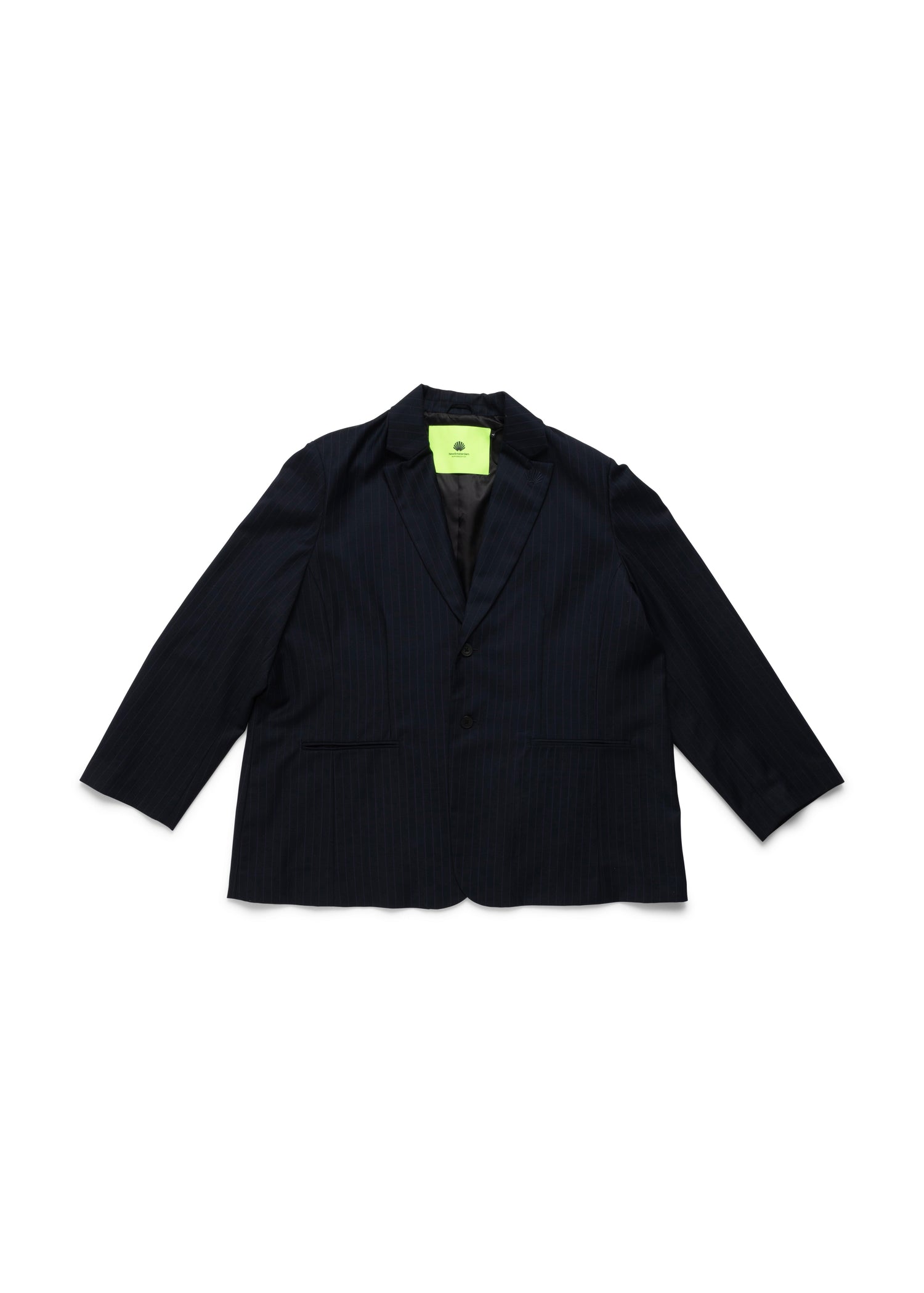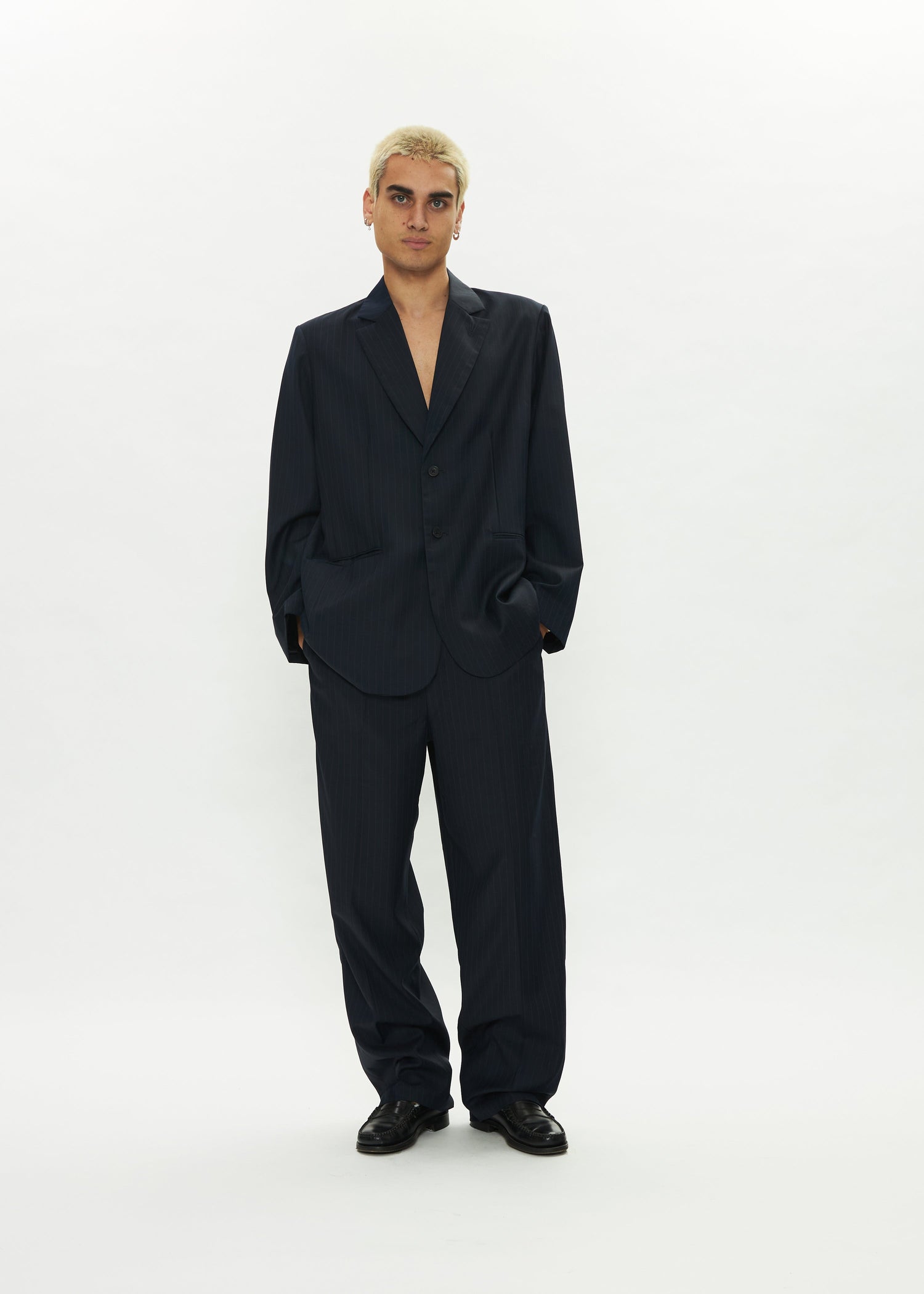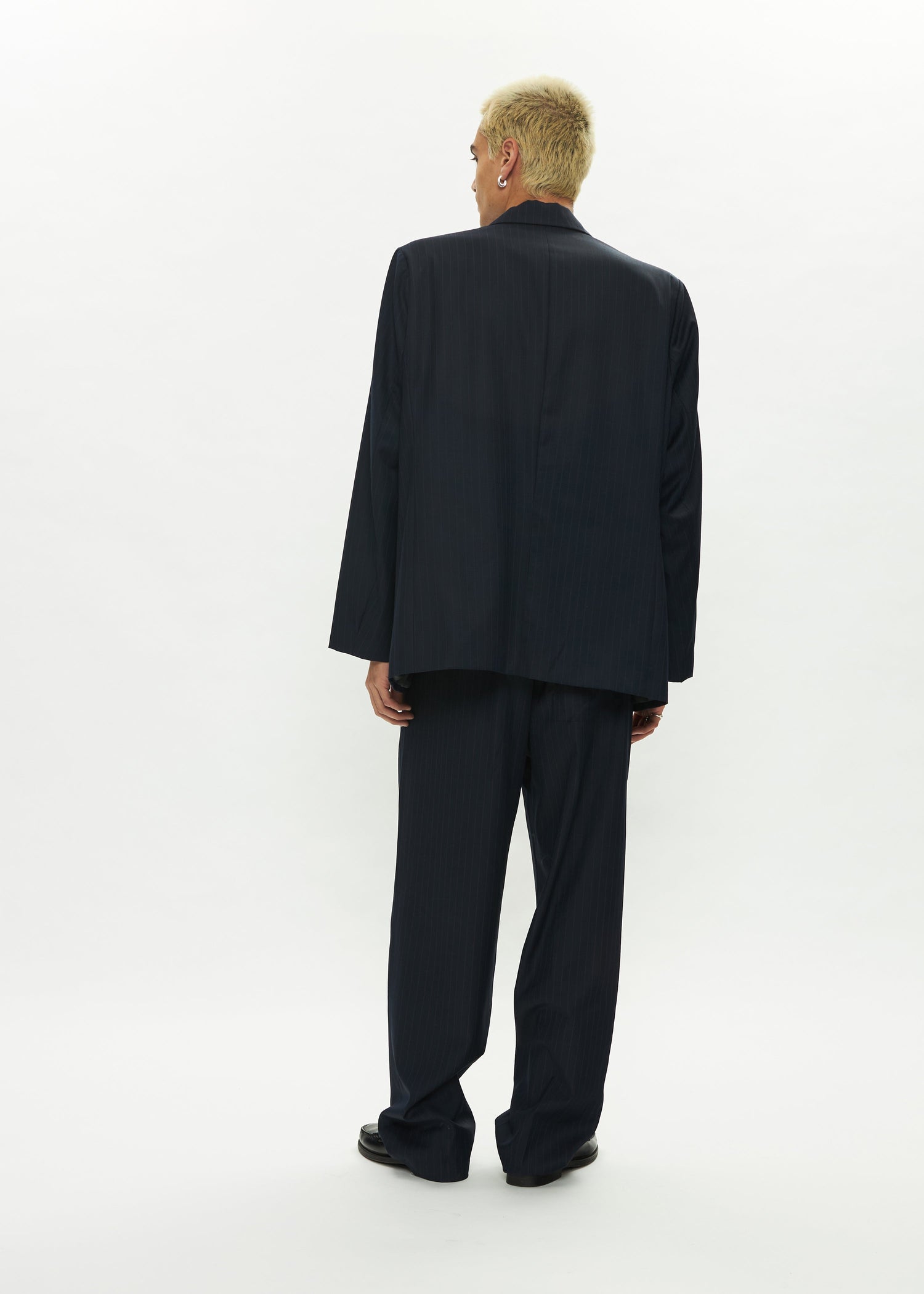 Relaxed fit suit jacket made from a pinstripe fabric. The jacket is lined with our branded black lining and is branded on the outside with our label on the left sleeve. It also has a tonal shell embroidery on the lapel. The waist is adjustable by a cord.