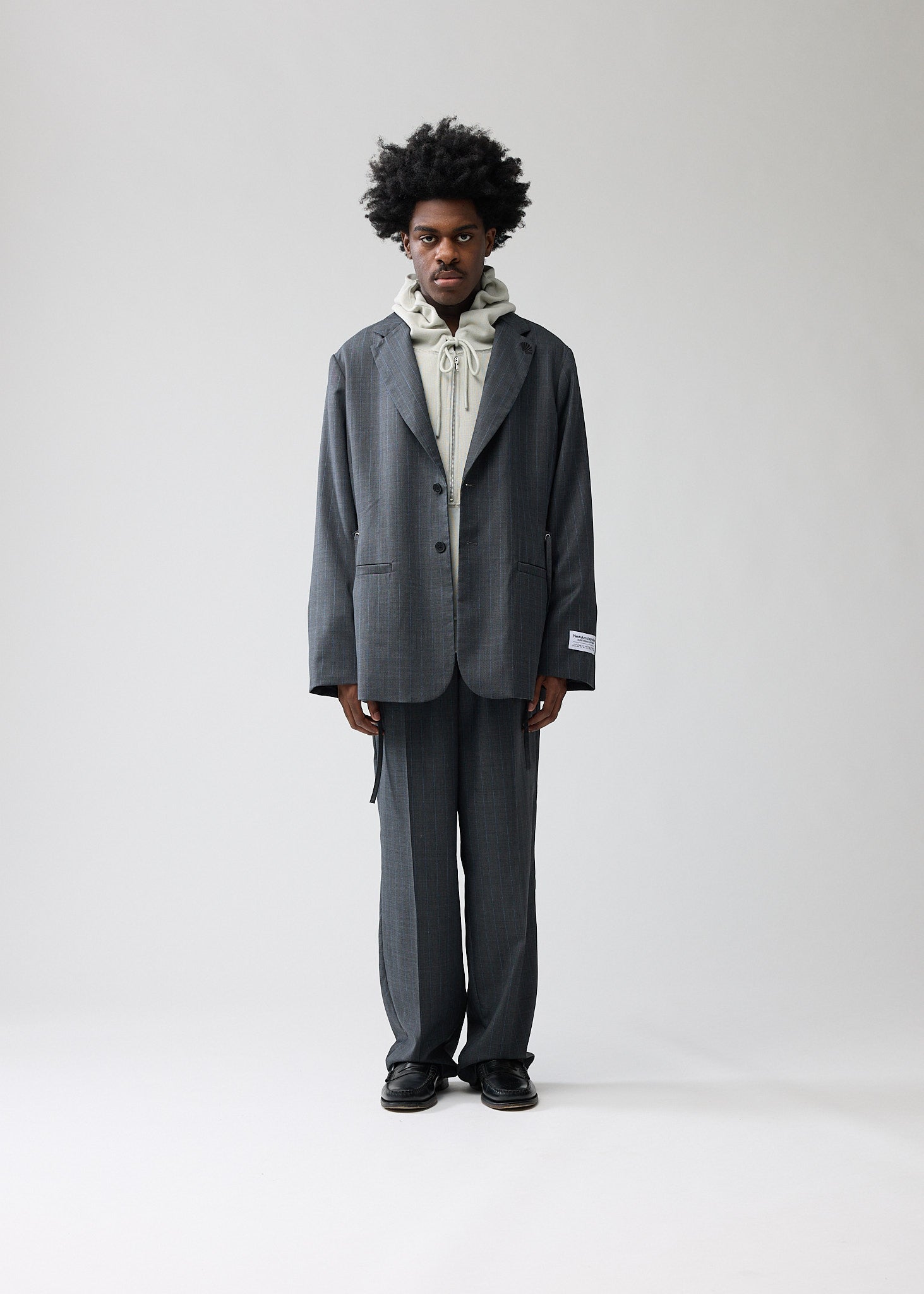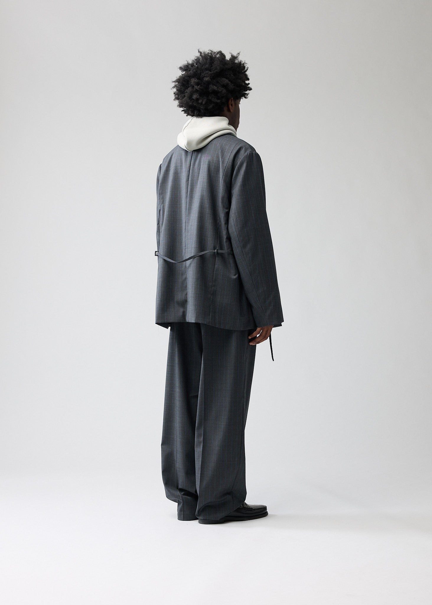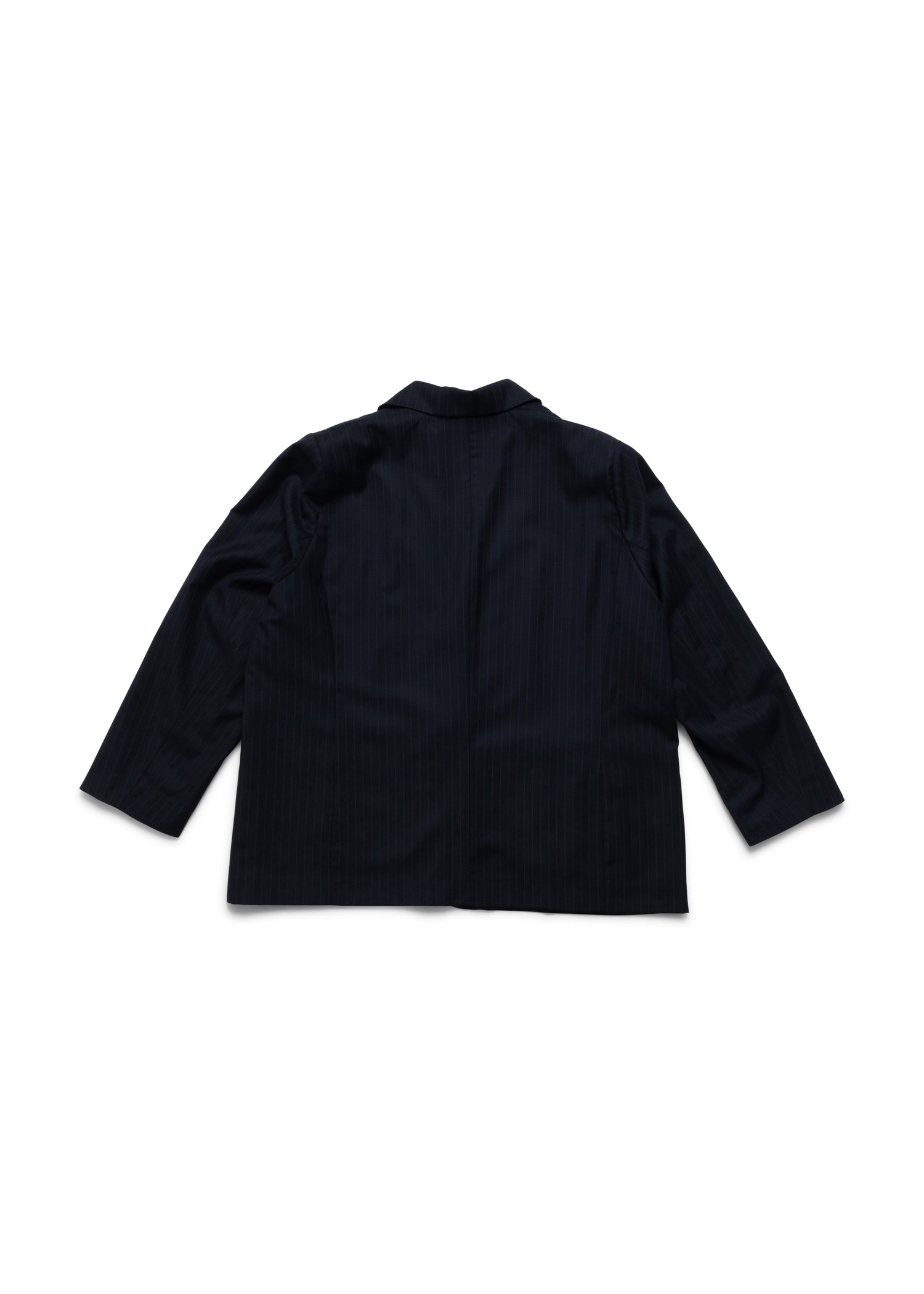 Relaxed fit suit jacket made from a pinstripe fabric. The jacket is lined with our branded black lining and is branded on the outside with our label on the left sleeve. It also has a tonal shell embroidery on the lapel. The waist is adjustable by a cord.