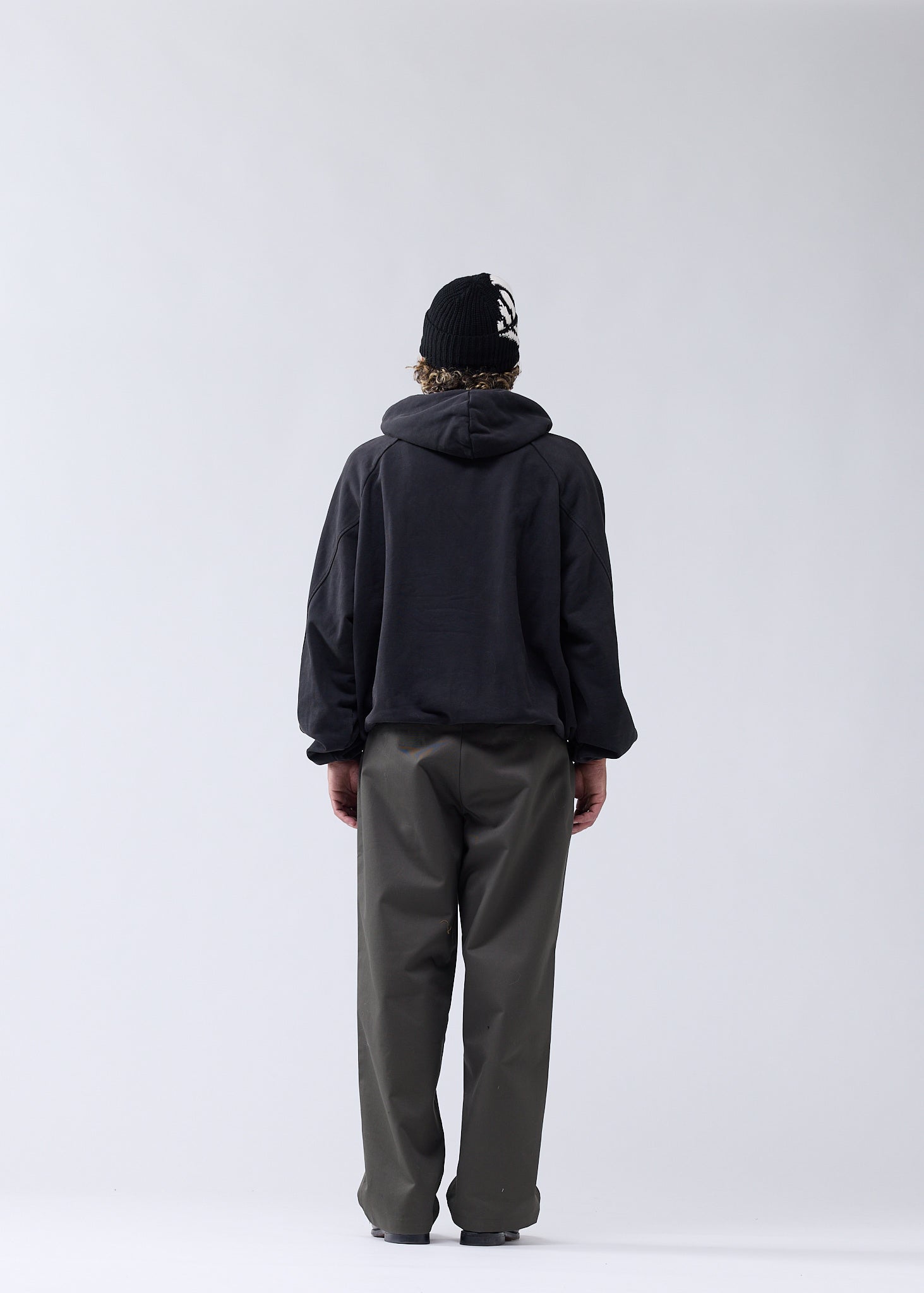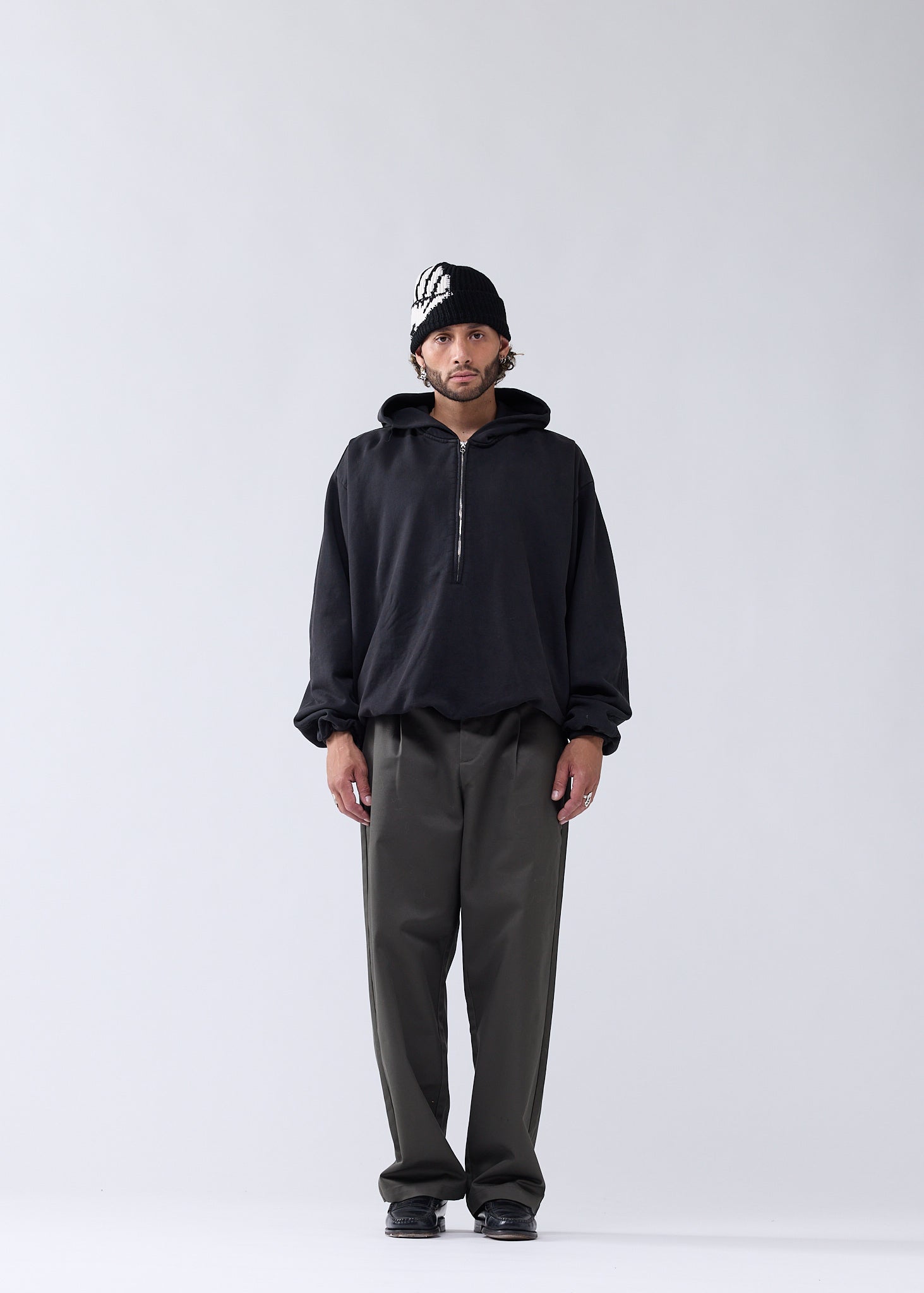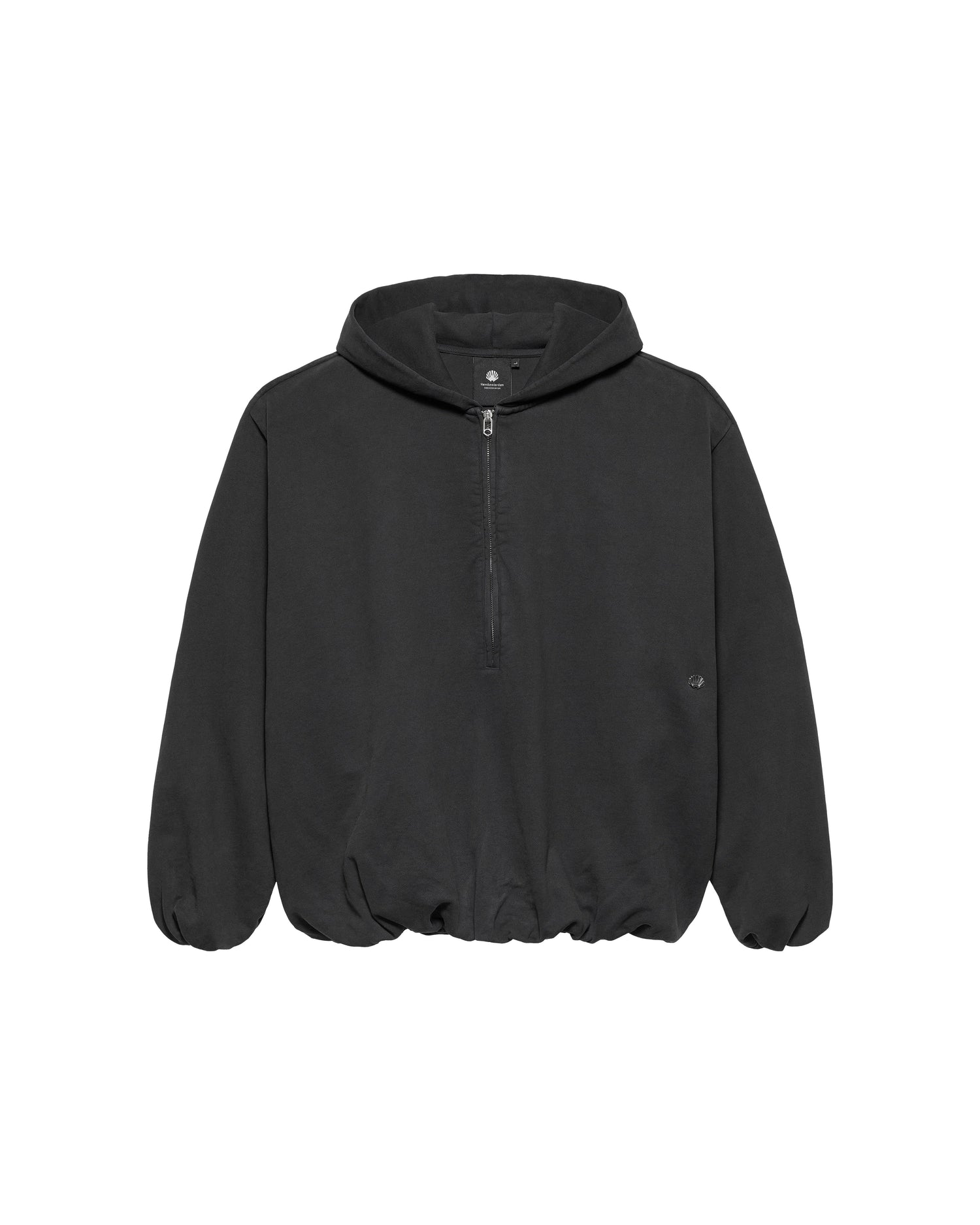 Classic half-zip hoodie cut to an oversized unisex fit with an inflatable look. Detailed with a metal shell rivet on the front. This hoodie is made of a heavyweight 455 GSM garment-dyed cotton terry and treated with PP-spray. The inflated silhouette is created by elasticated cuffs and hem on the inside, and the piece is fully lined with soft cotton jersey.