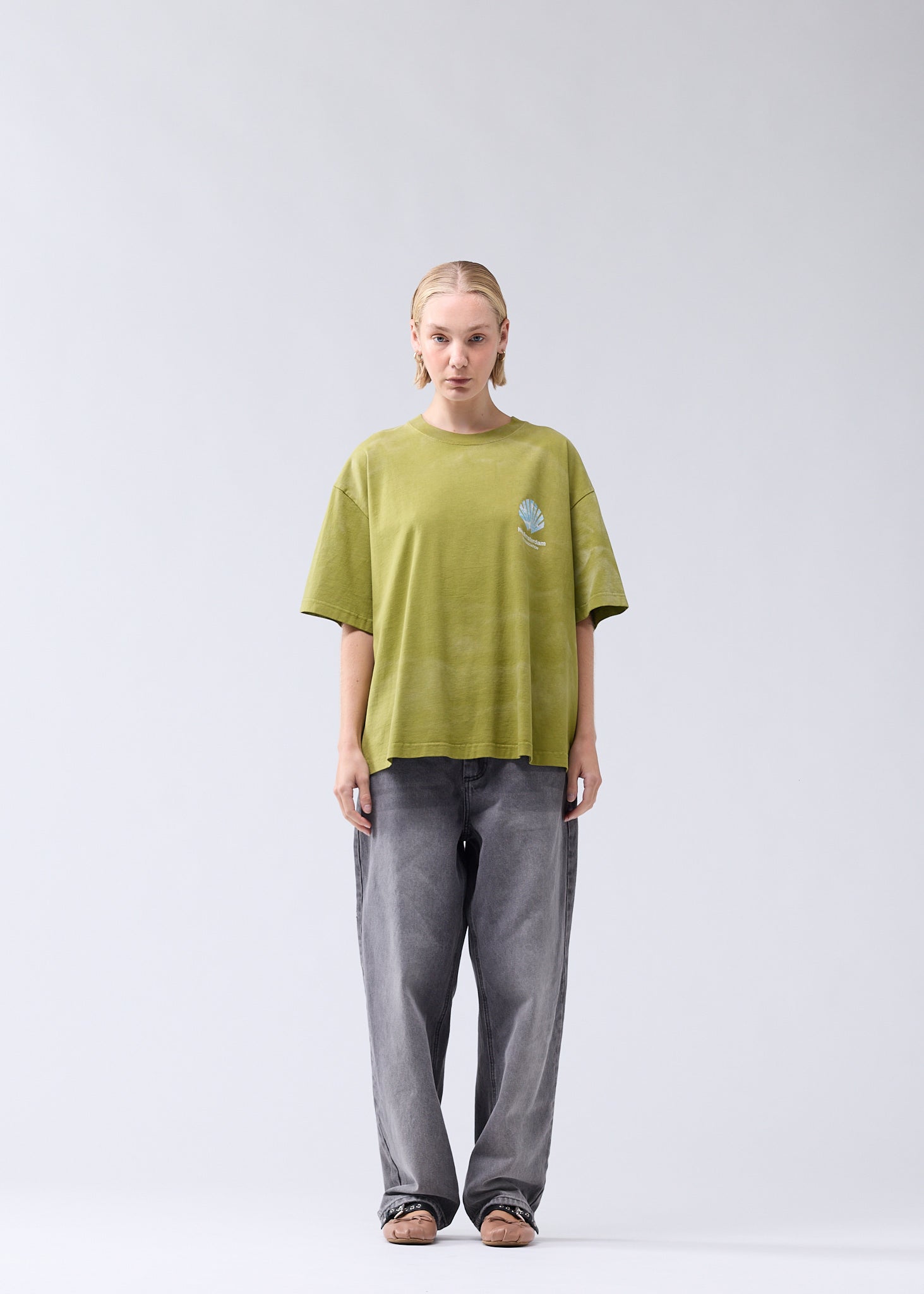 Crew neck t-shirt, cut to a cropped unisex fit. Detailed with a line up artwork discharge print on the front and back. This tee is made of a 240 GSM garment dyed and cotton and treated with PP-spray.