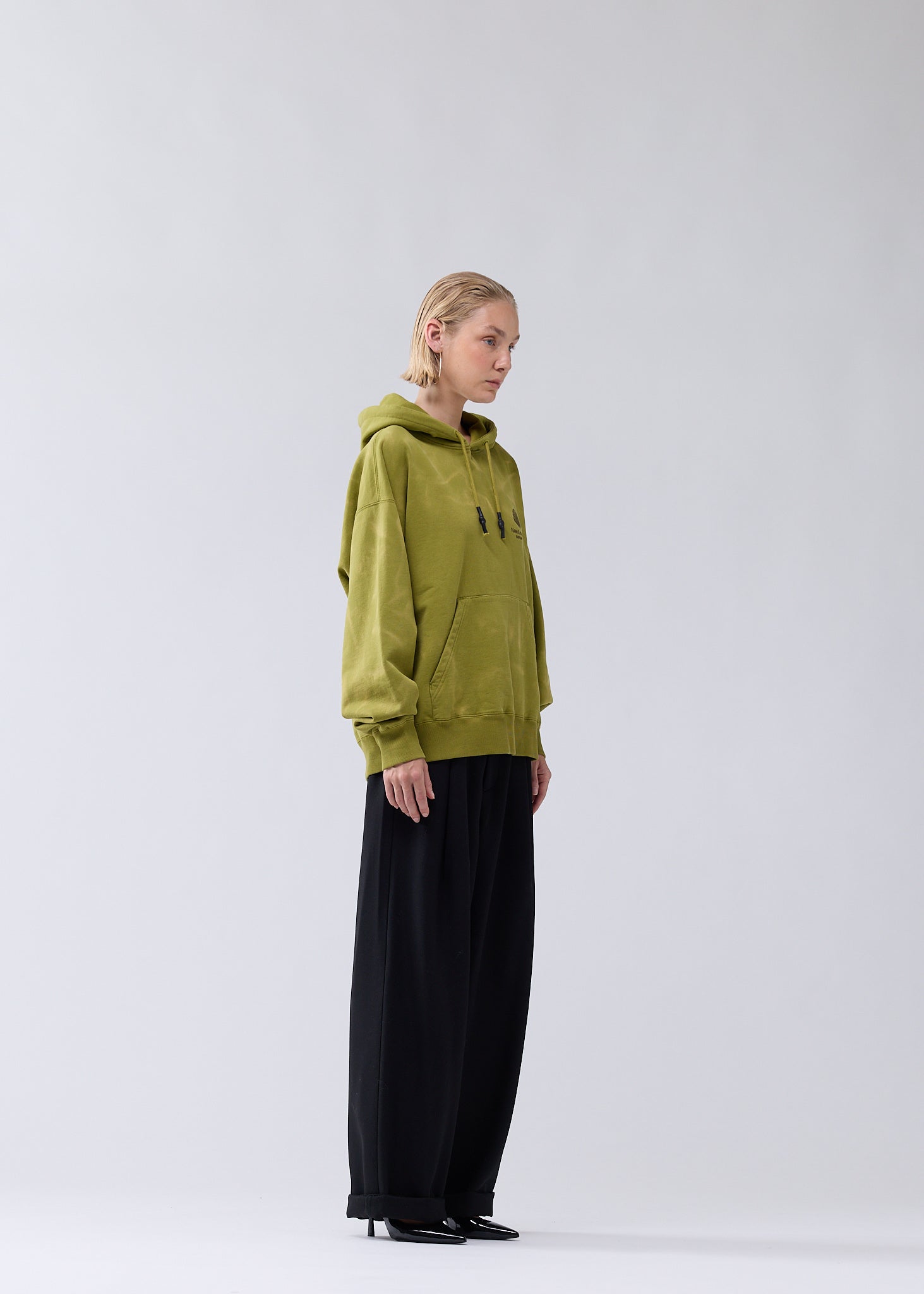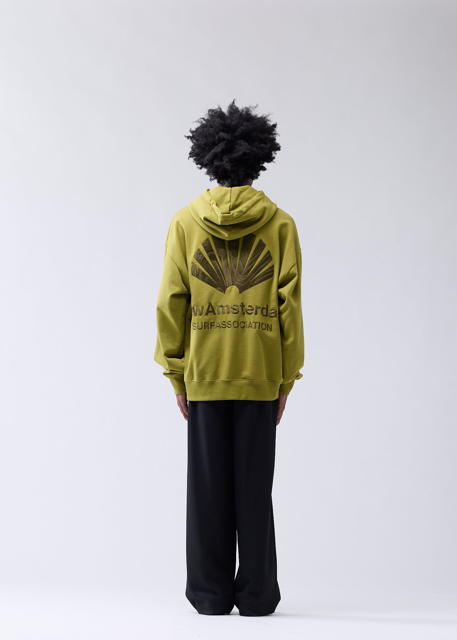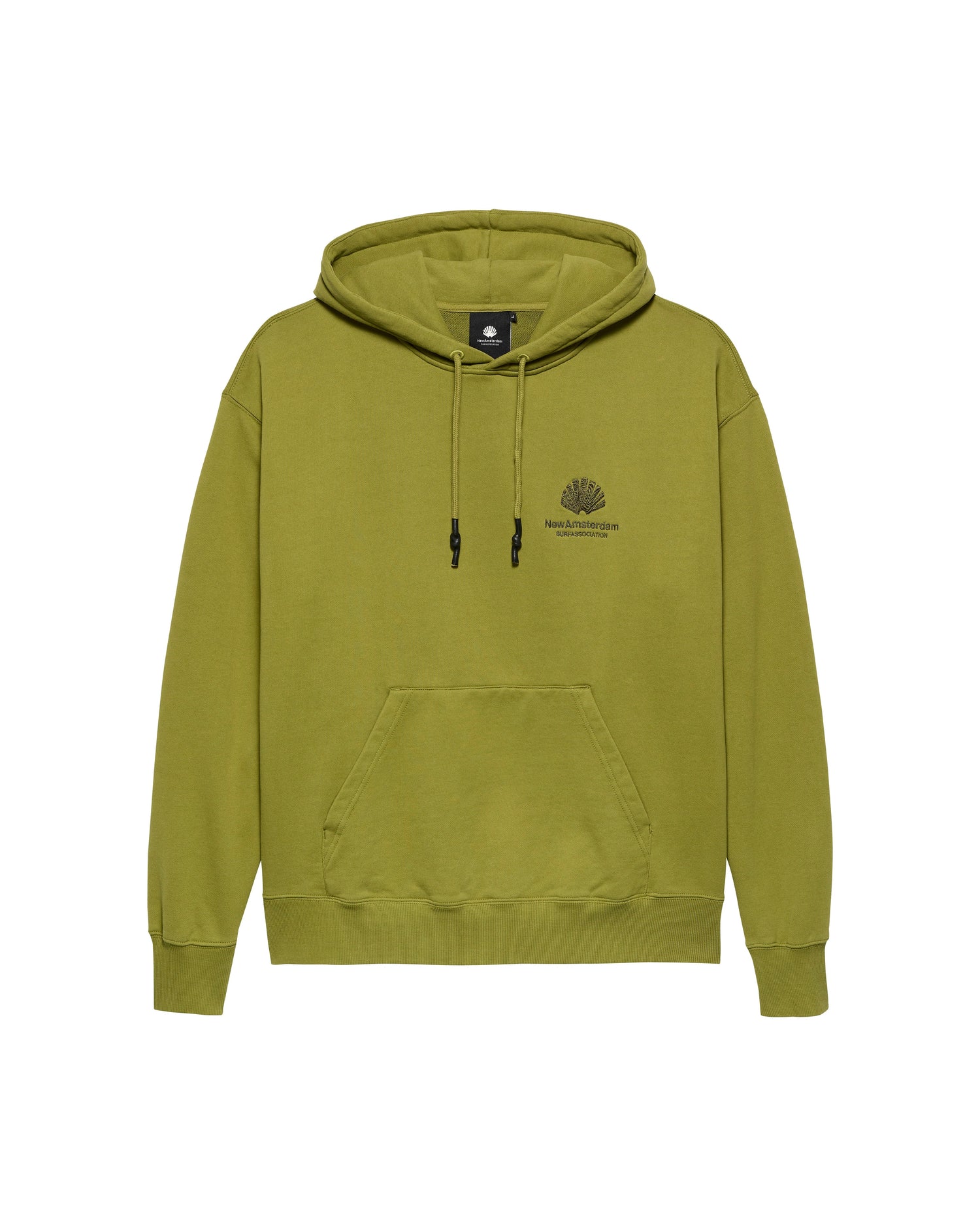 Hooded sweater, cut to a relaxed unisex fit. Detailed with the classic New Amsterdam logo embroidery on the front and back, made using two different colored yarns and varied embroidery structures. This hoodie is made out of a heavyweight 455 GSM garment-dyed cotton.