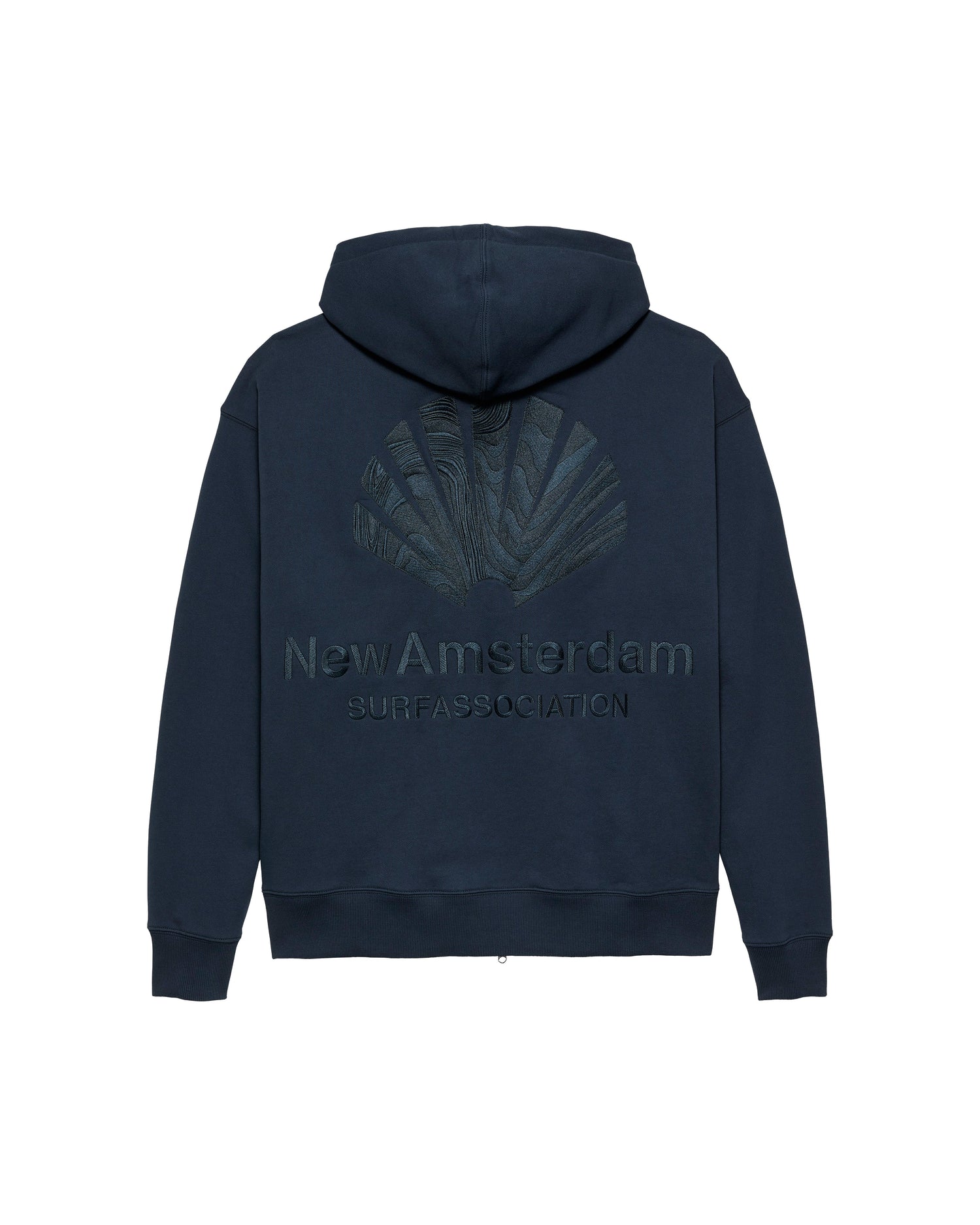 Hooded zipper sweater, cut to a relaxed unisex fit. Detailed with a seasonal New Amsterdam logo embroidery on the front and back. This hoodie is made out of a heavyweight 455 GSM garment-dyed cotton.