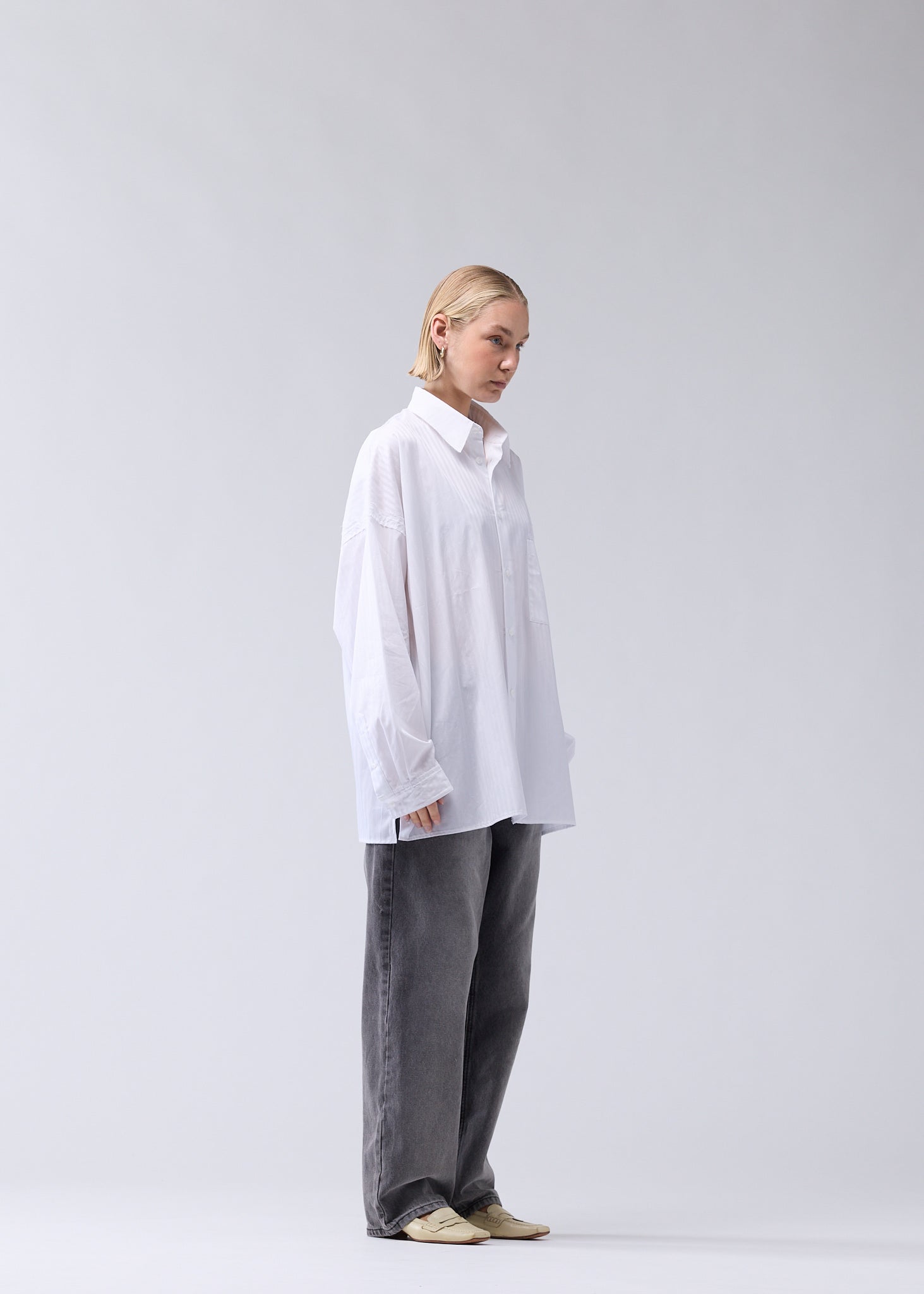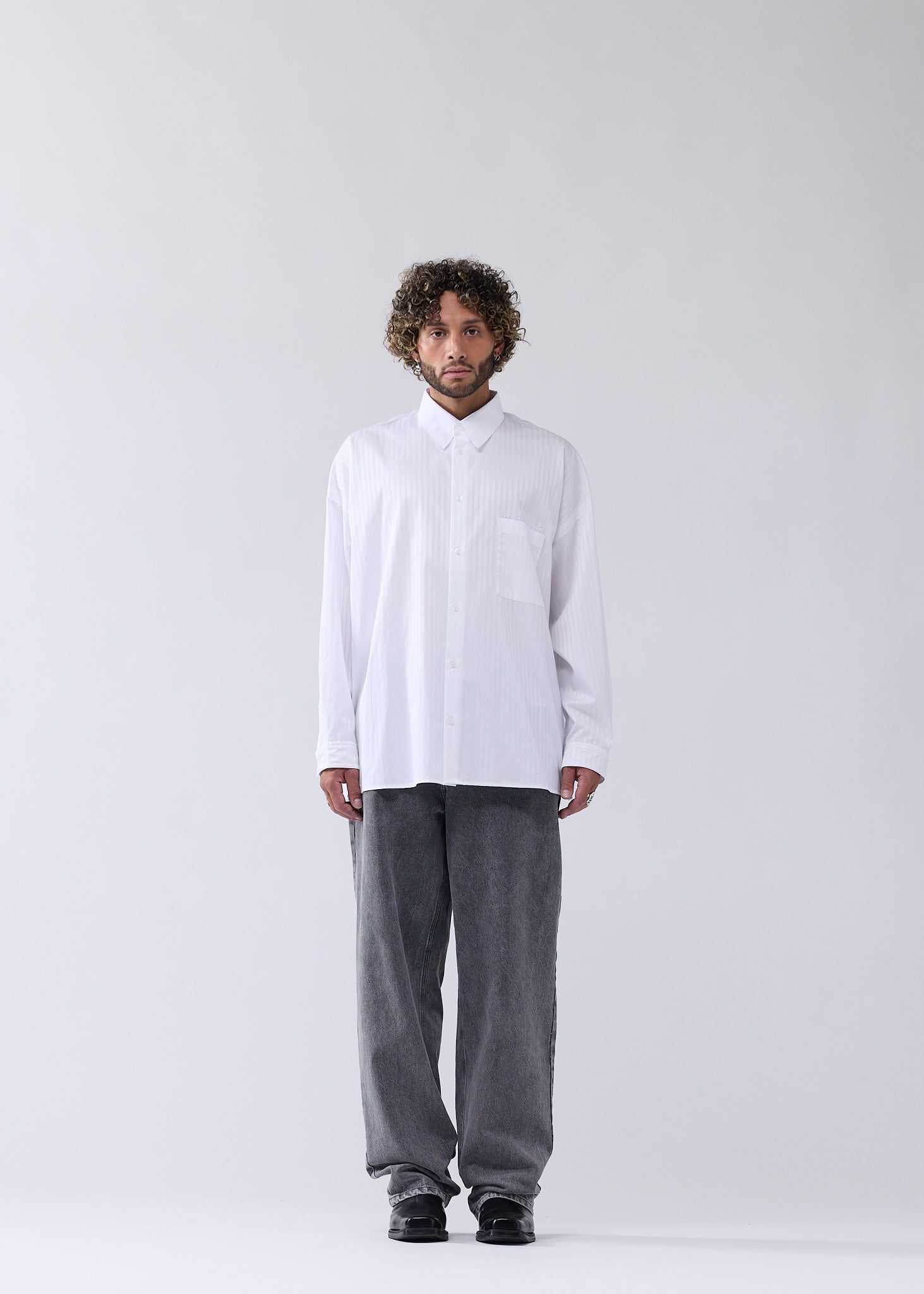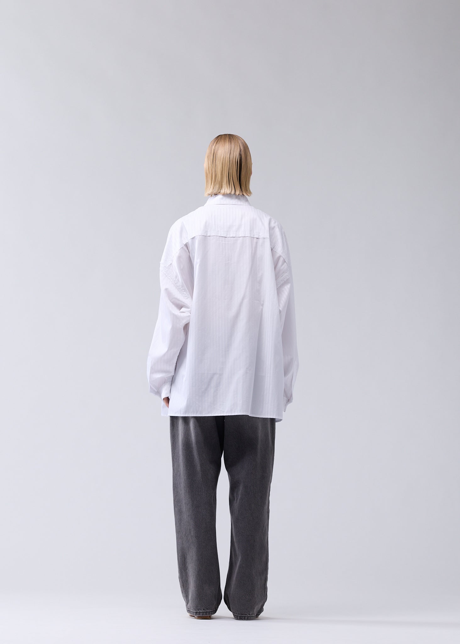 Button-up shirt crafted from a cotton jacquard stripe, designed in a oversized fit that falls below the hip. Features a chest pocket with subtle embroidery detail and is finished with raw edge seams at the shoulder, armhole and cuffs.