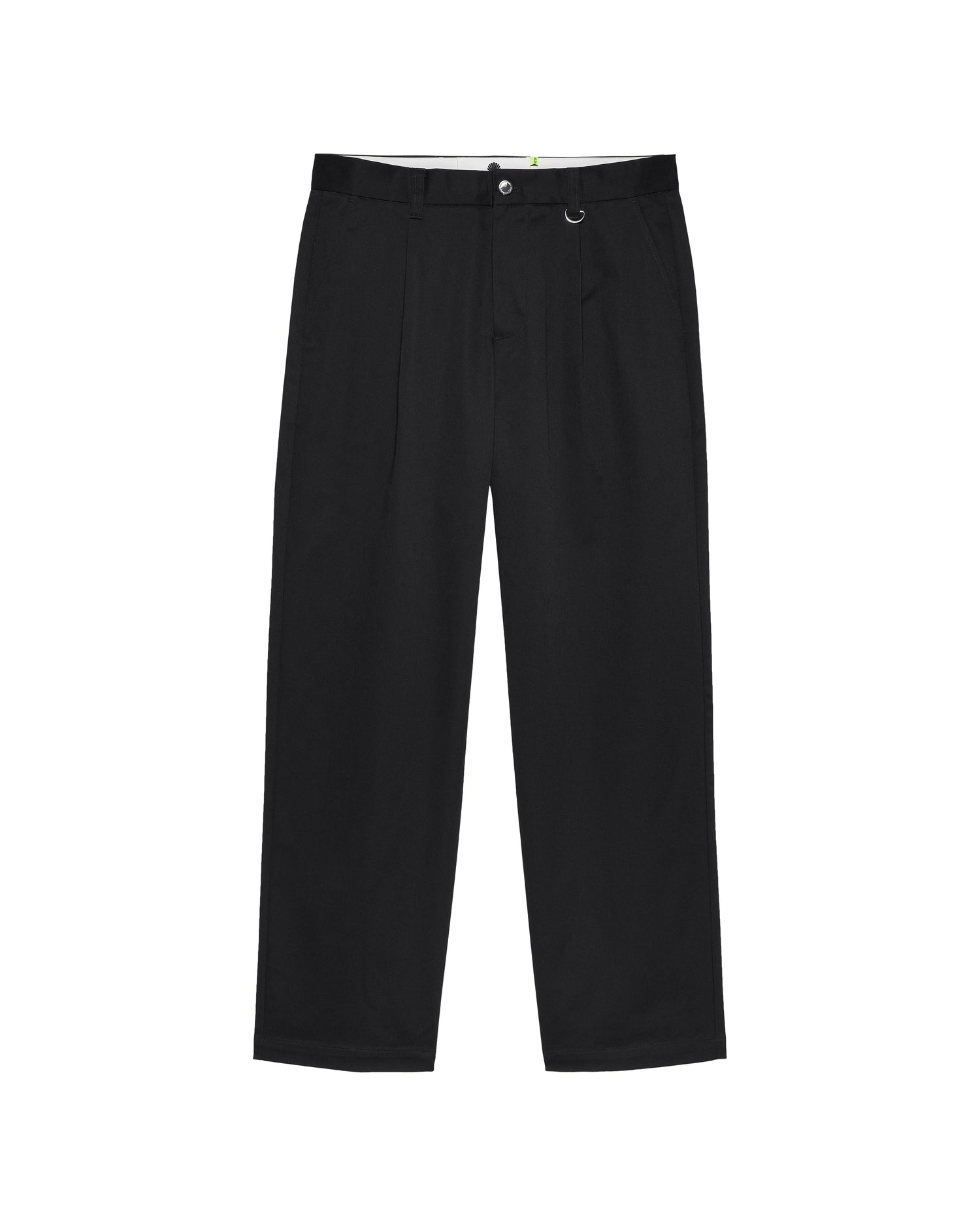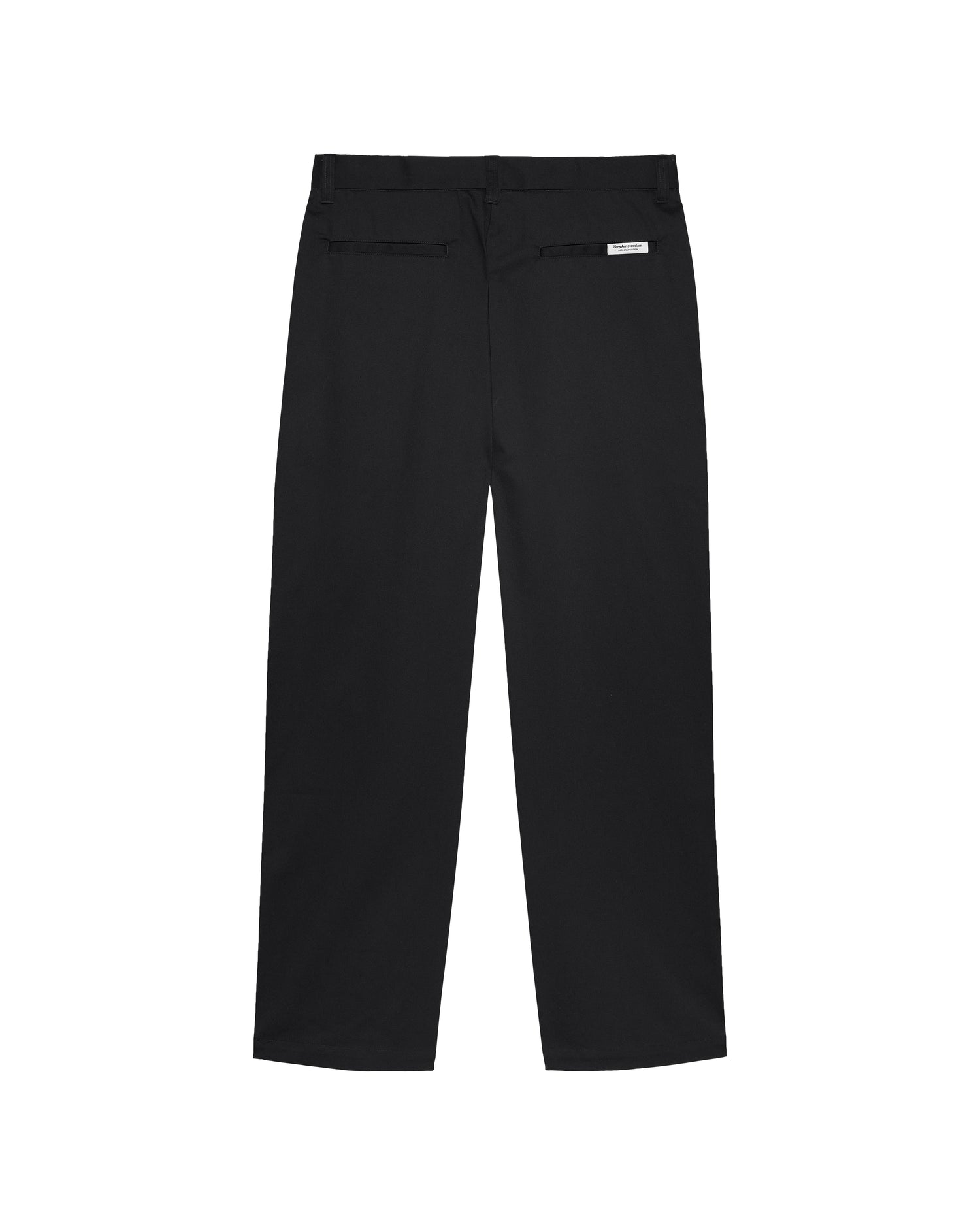 Workwear trouser cut to a relaxed fit with a mid waist and a straight leg, available in two lengths. Detailed with a metal branded button and D-ring, front pleats, New Amsterdam woven label and branded inner waistband. This pant is made out of a cotton polyester twill.