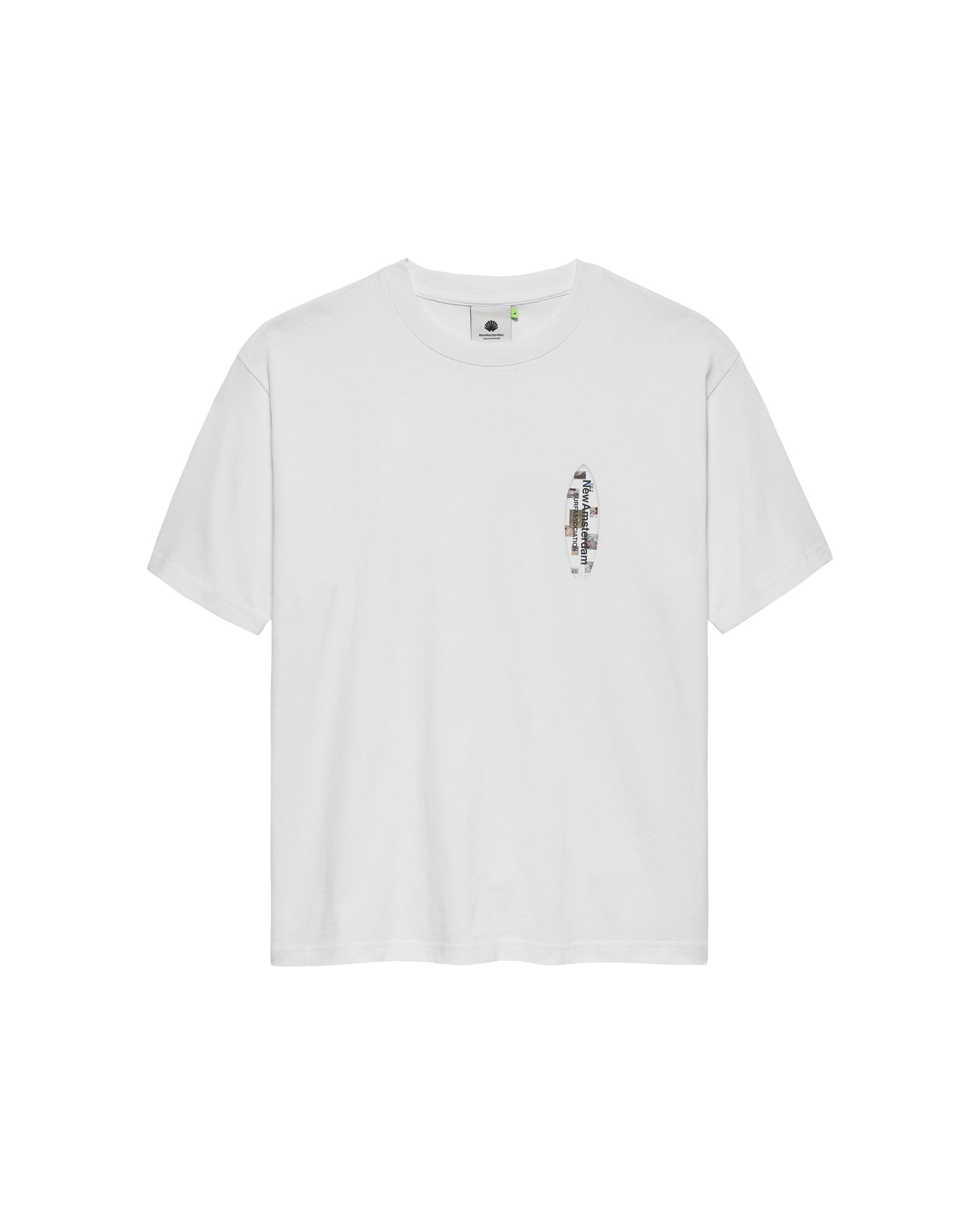 Crew neck t-shirt, cut to a regular unisex fit. Detailed with a seasonal branded 'surf zine' artwork digital print on the front and back. This tee is made of a 240 GSM fabric dyed and garment washed cotton.