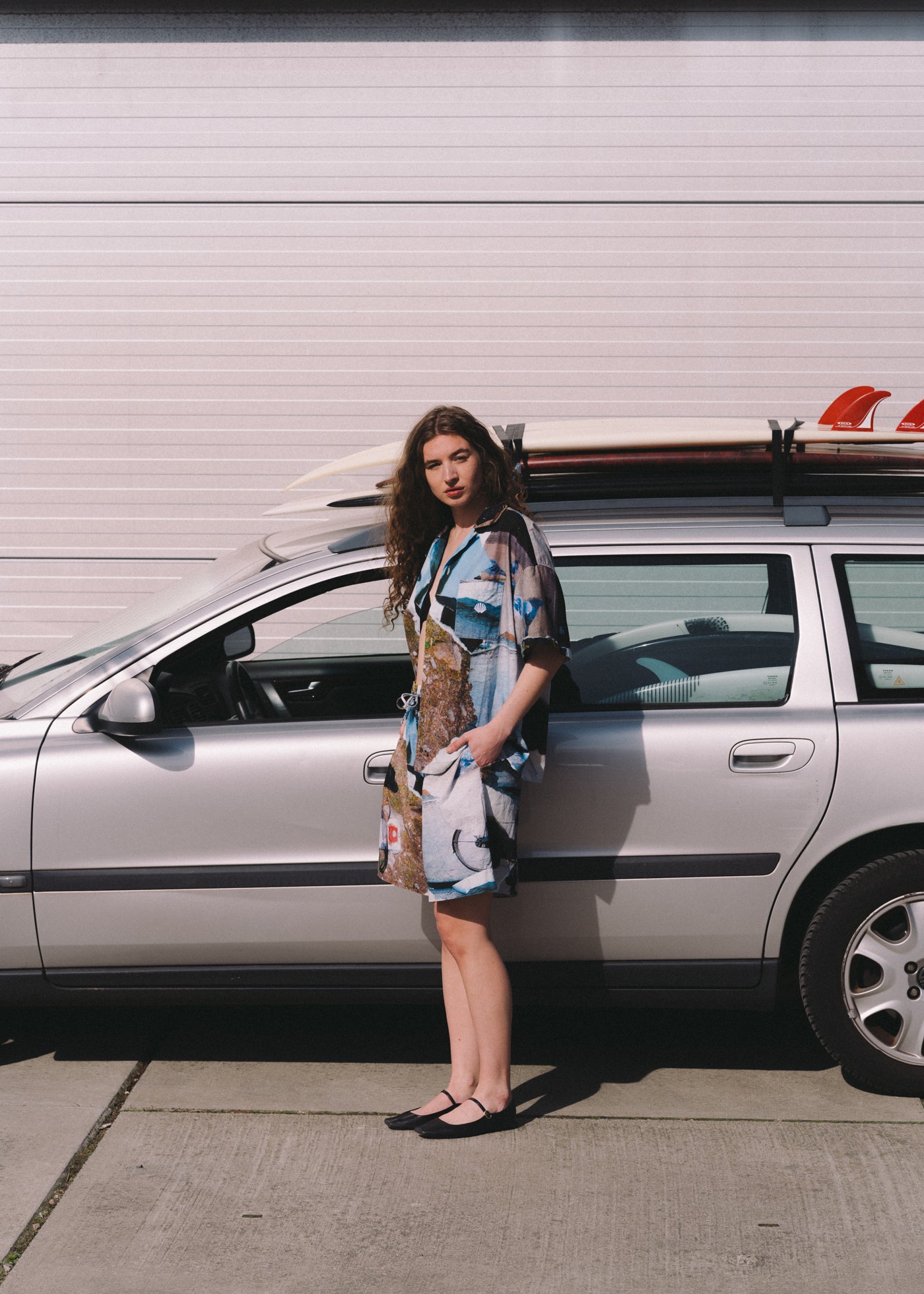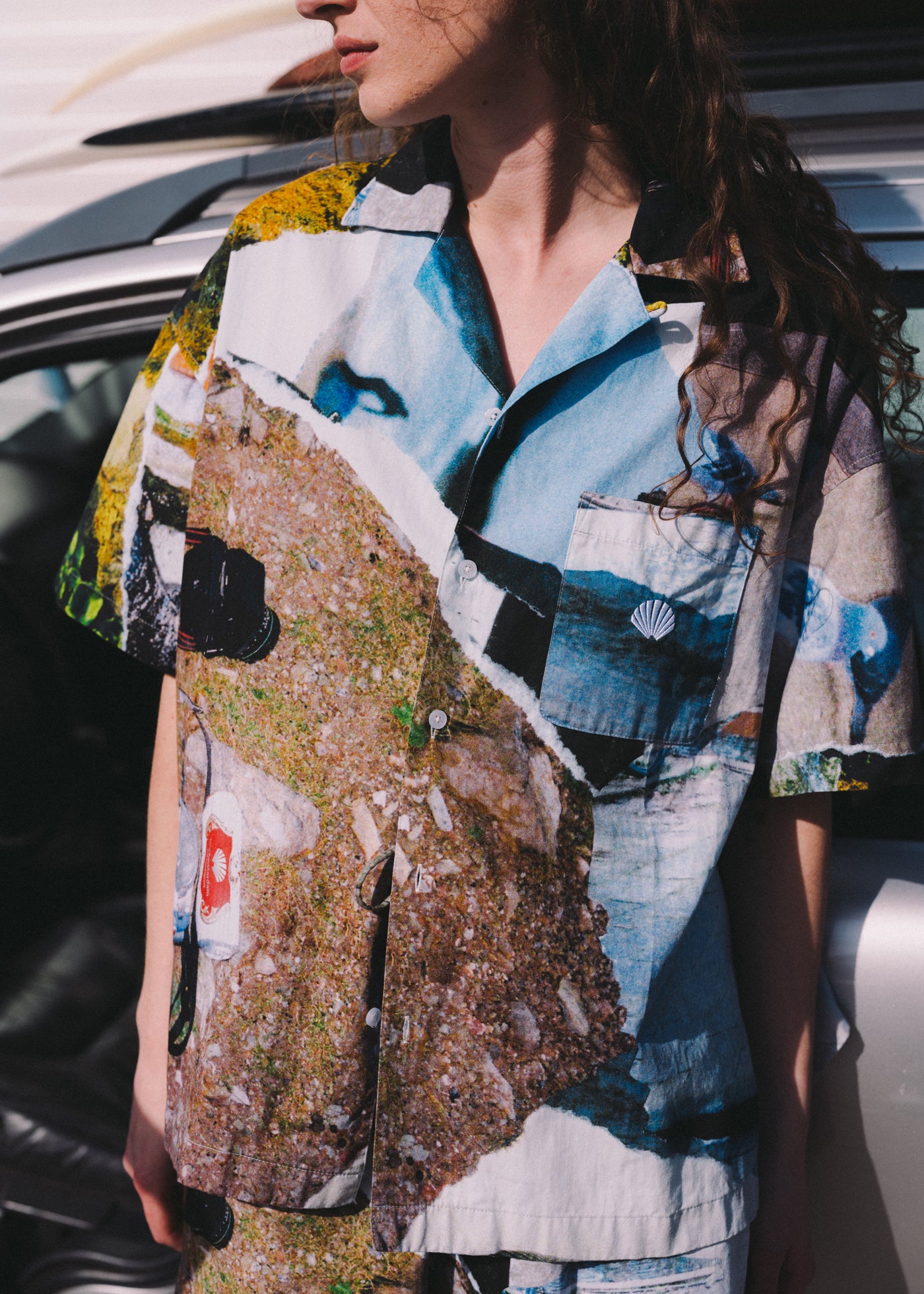 This shirt is made of a cotton twill with a seasonal allover photo print. The shirt has a slightly oversized fit with a straight hem. Detailed with a pocket on the left chest and shell embroidery centered on the pocket.