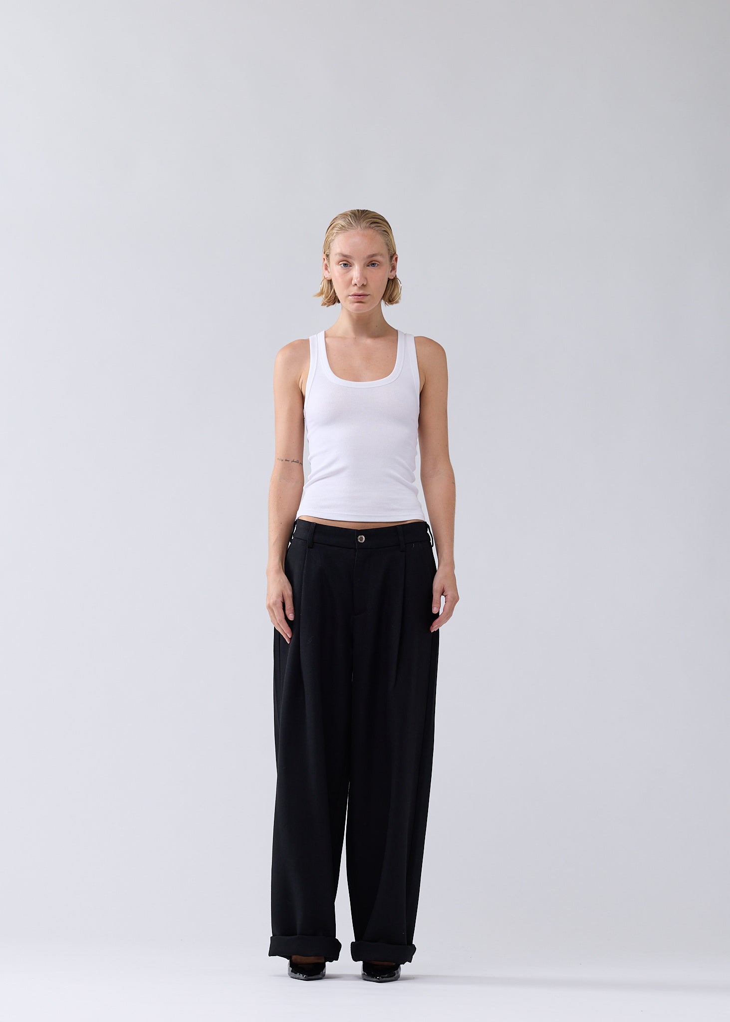 Tailored suit trousers, cut to an oversized fit with a mid-rise waist. Made from a heavy twill fabric with an anti-pilling treatment for[b][/b] durability and a clean look. Designed with a half-elasticated waistband and wide, full-length straight legs. Finished with front pleats, slanted side pockets, a mix of welt and flap pockets at the back, and a branded metal button closure.